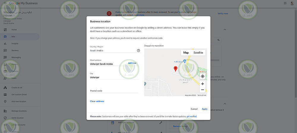 تم اضافة الموقع بنجاح بكافة تفاصيله..متبقي فقط التأكد من صحة الموقع من قبل جوجل..مفترض انه سيصل لكم خلال أيام جواب من جوجل به رمز تأكيدي..بمجرد إرسال هذا الرمز لي سيتم التحقق من صحة المكان و نشره بشكل مباشر للعامة...مرفق صور توضيحية للبيزنس