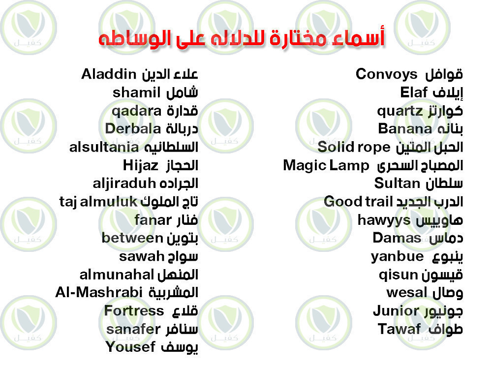 مايلى مجموعه من الأسماء المستوحاة من اشتقاق الإسم فمنها من له مدلول مقصود ومنها من له مدلول تبسيطى لمعنى المفهوم ويبدو احتكارى