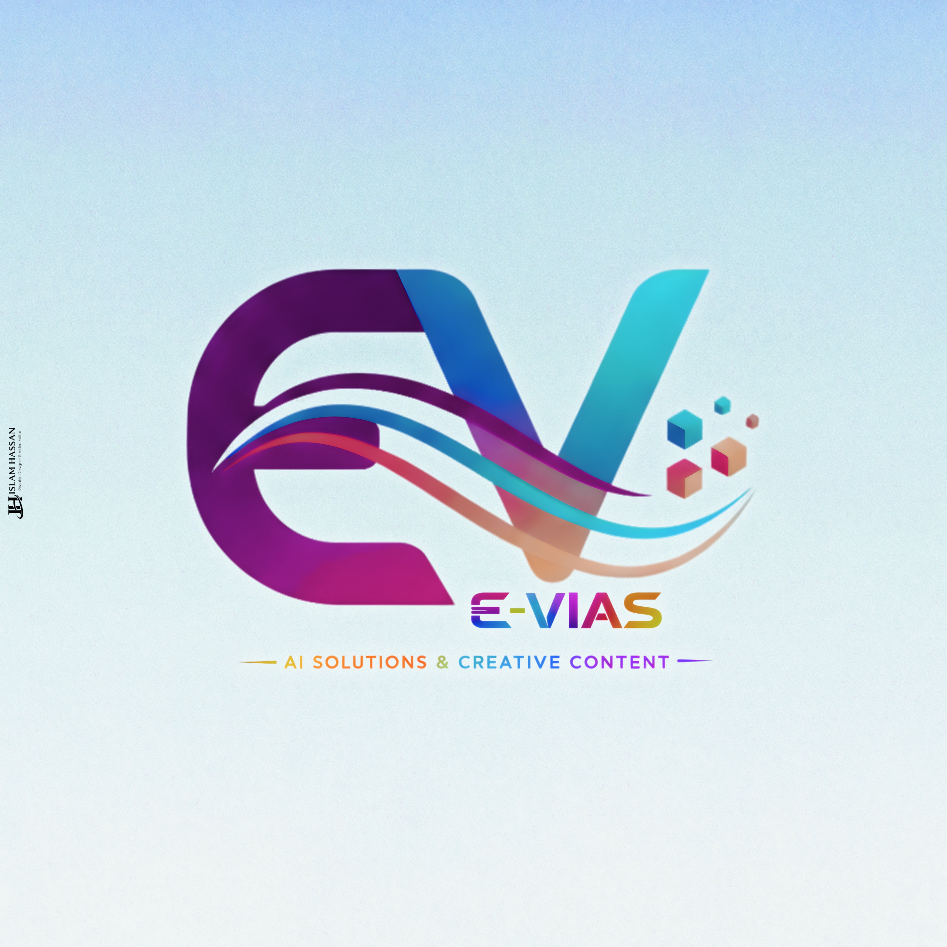 الحروف المدمجة (E & V) تعبر عن اسم العلامة، بينما الخطوط المتدفقة تشير إلى تدفق البيانات، الأفكار، والابتكار الرقمي.