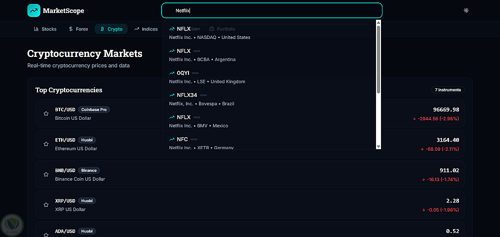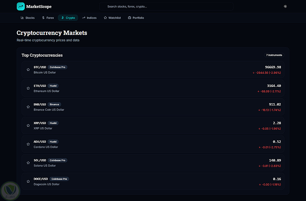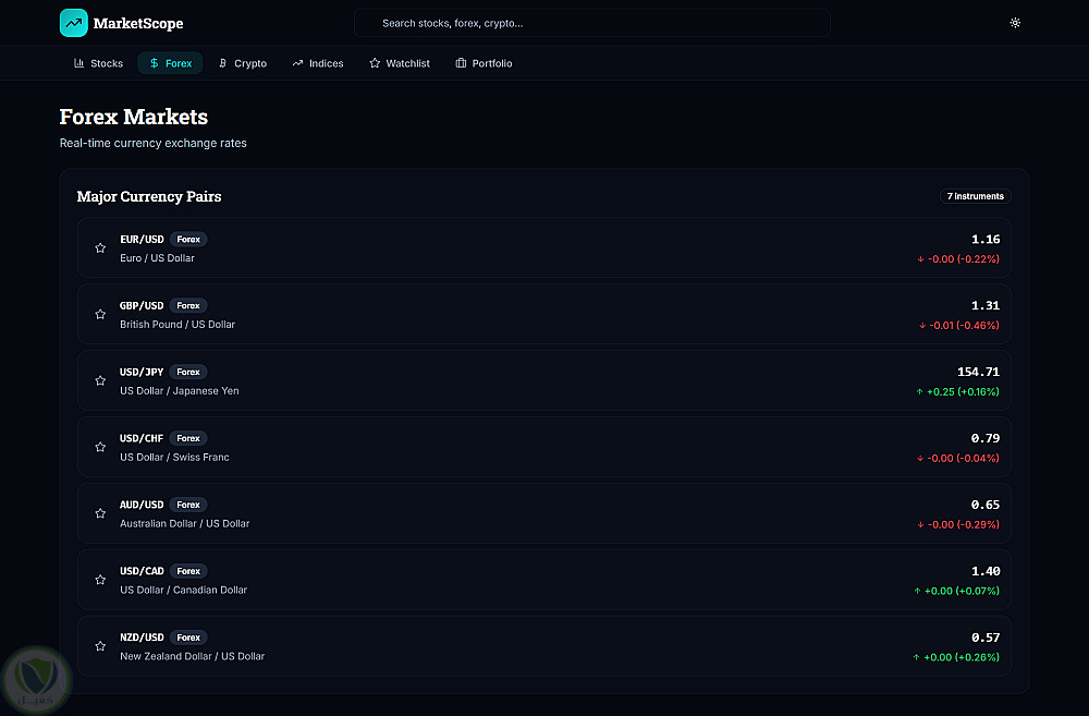 صفحات مثل: الأسهم – العملات – الكريبتو – المؤشرات – قائمة المراقبة – المحفظة