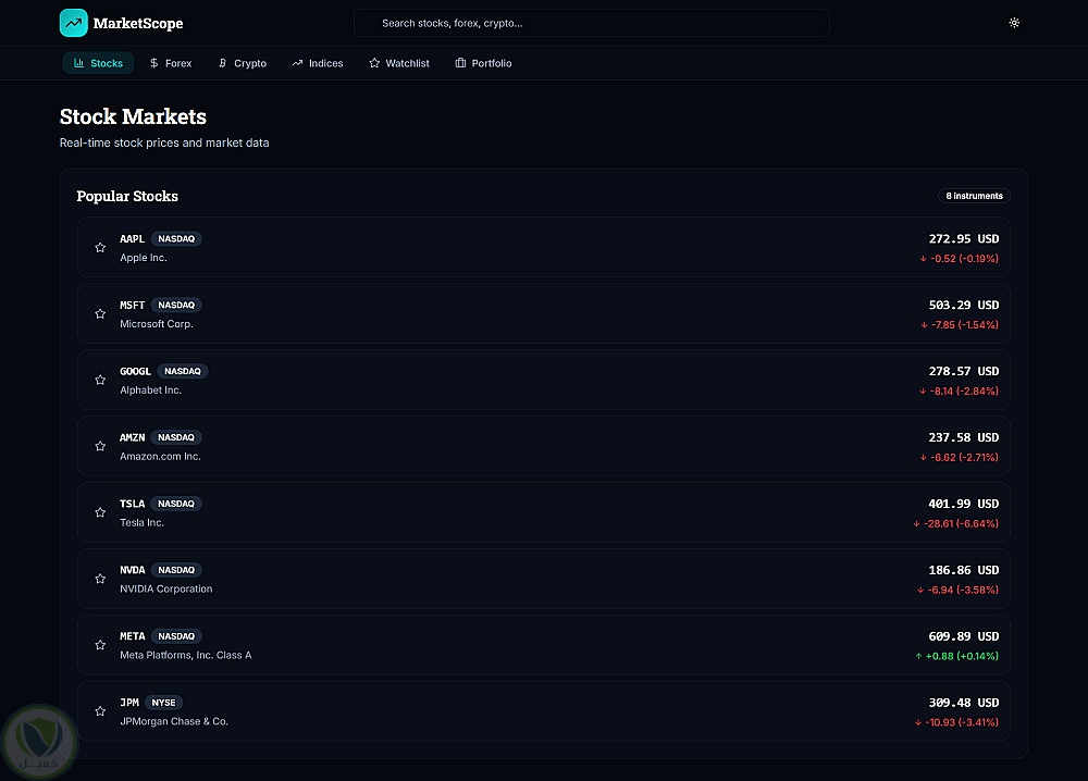 قمت بتصميم وتطوير واجهة Dashboard تفاعلية لعرض أسعار الأسهم العالمية في الوقت الحقيقي. الواجهة مبنية باستخدام React.js مع تصميم داكن عصري يركز على سهولة القراءة والتنقل.