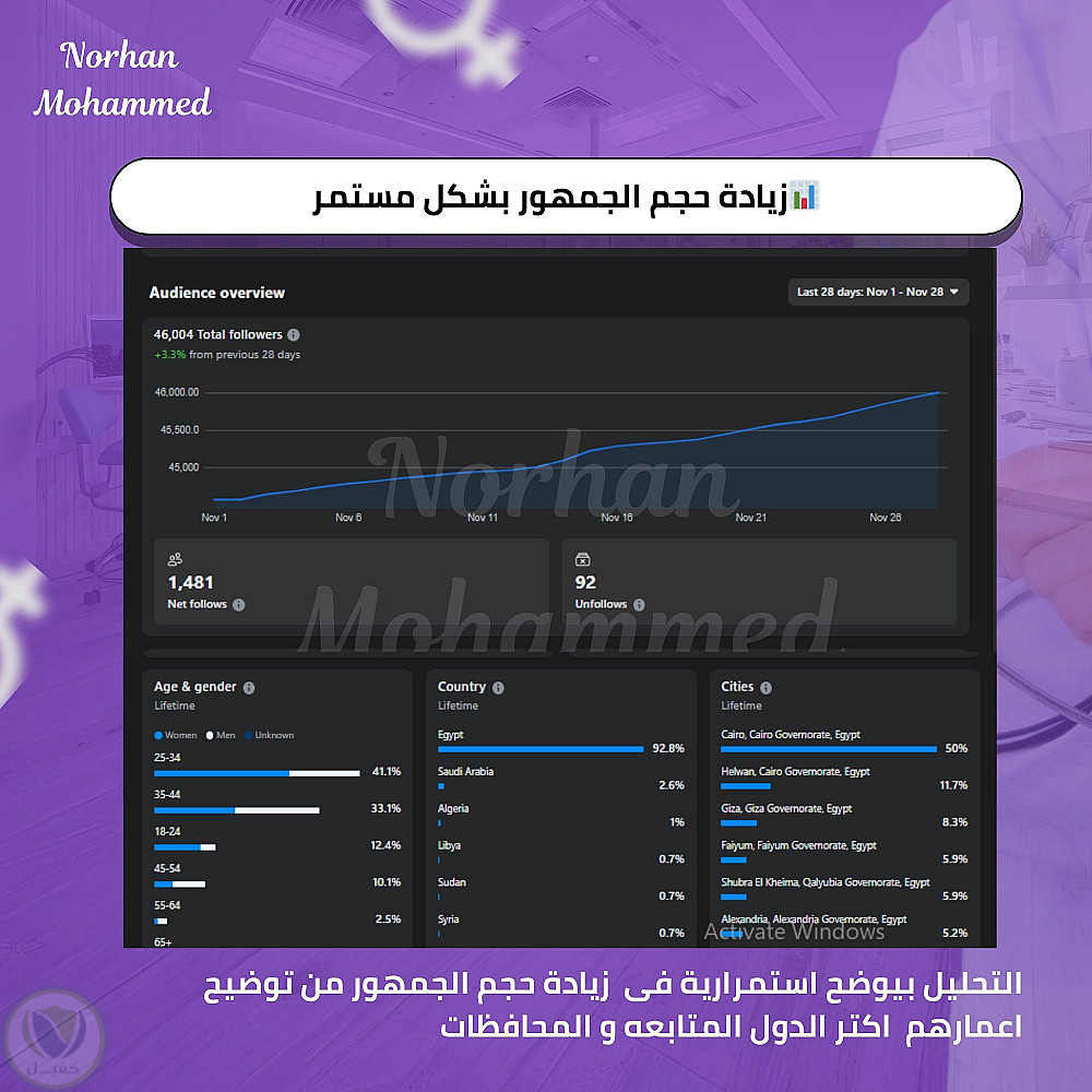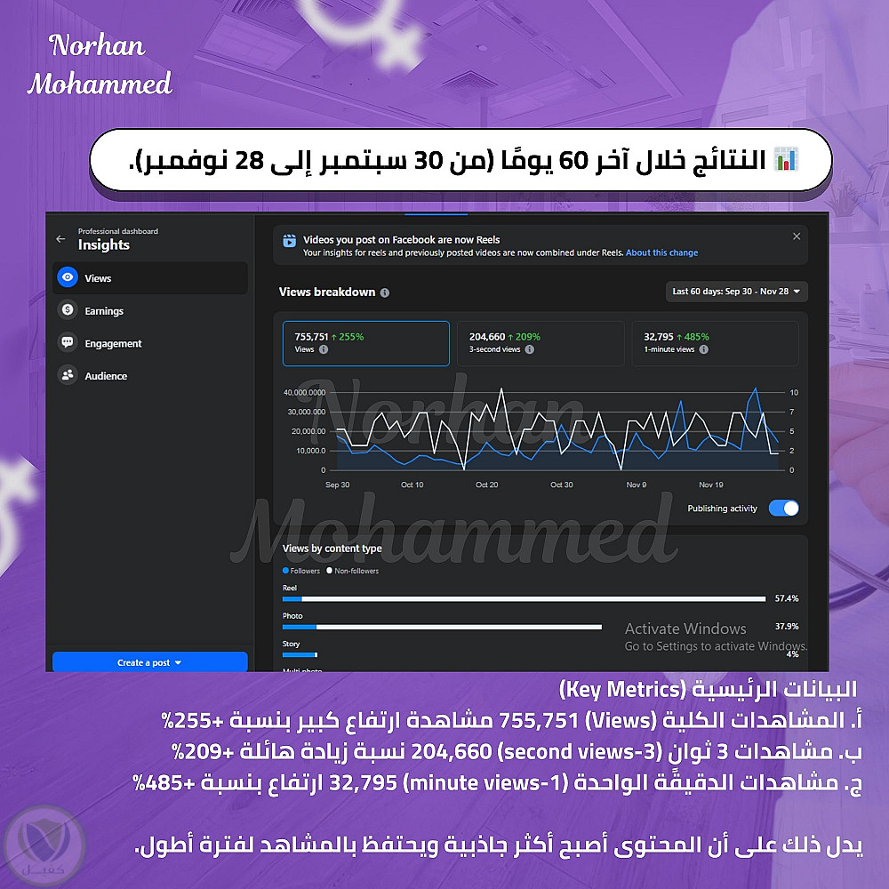 خلال آخر 60 يومًا حققت الصفحة نموًا كبيرًا بفضل التركيز على الفيديوهات القصيرة (Reels)، ما أدى إلى ارتفاع واضح في المشاهدات والتفاعل وتحسن معدل الاحتفاظ بالمشاهد. هذه النتائج تعكس نجاح الاستراتيجية وقدرتها على جذب جمهور جديد وتعزيز ثقة المتابعين.