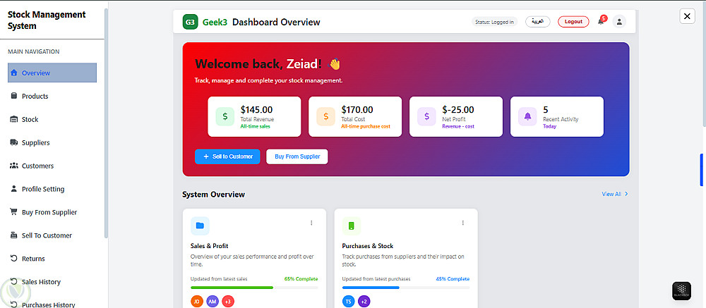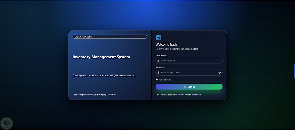 هذا مشروع نظام إدارة مخزون متكامل يوفر لوحة تحكم حديثة تمنح المستخدم رؤية شاملة لكل حركة داخل النظام، من تسجيل الدخول حتى إدارة المنتجات.