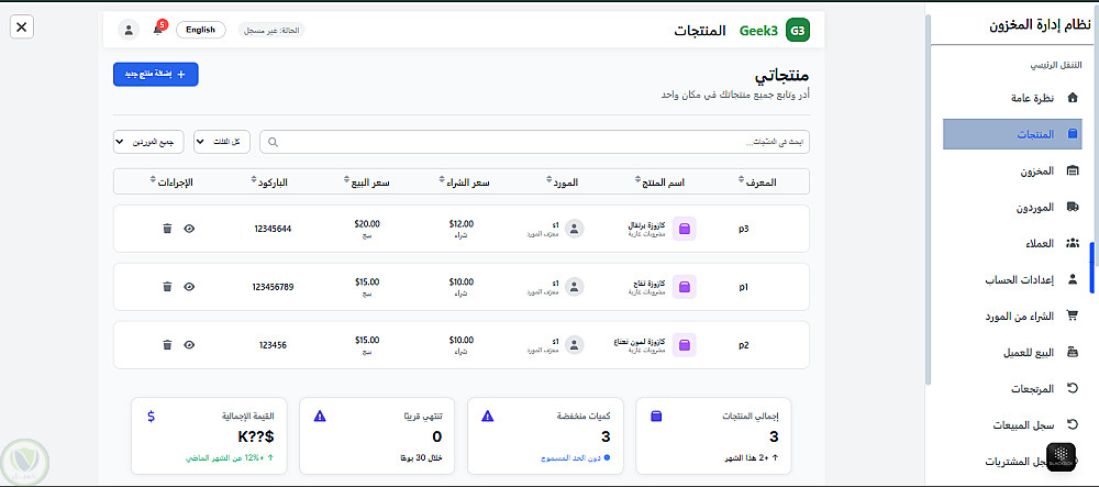 إحصائيات لحظية، متابعة حركة المنتجات، تنبيهات الكميات المنخفضة، وعمليات CRUD كاملة، مع تصميم متجاوب يناسب كل الأجهزة.