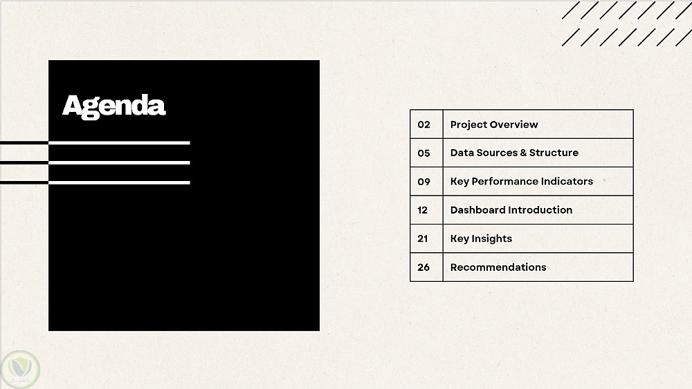 يتضمن هذا المشروع عرضاً تقديمياً على PowerPoint لعرض لوحة Power BI تفاعلية. تحتوي الشرائح على ميزات متقدمة مثل التكبير، الرسوم المتحركة، والانتقالات السلسة لتسليط الضوء بفعالية على أهم المؤشرات والبيانات. تم تصميم العرض لتوجيه المشاهدين عبر اللوحة بشكل تفاعلي، مما يجعل البيانات المعقدة سهلة الفهم وجذابة لصناع القرار.