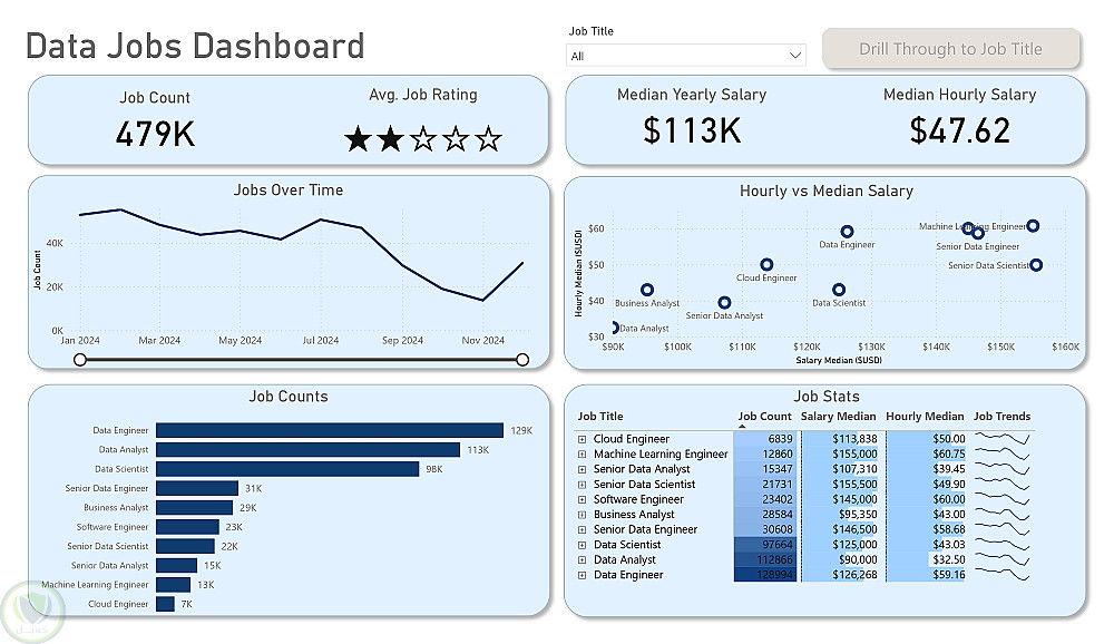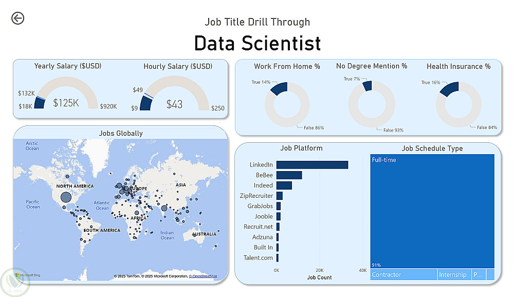 تم إنشاء هذه اللوحة التفاعلية لمساعدة الباحثين عن عمل، والمتحولين وظيفيًا، وأيضًا الراغبين في تبديل وظائفهم، من أجل حل مشكلة شائعة: وهي أن المعلومات المتعلقة بسوق وظائف البيانات مشتتة وصعبة الفهم. باستخدام مجموعة بيانات حقيقية من إعلانات وظائف علوم البيانات لعام 2024 (بما في ذلك المسمّيات الوظيفية، والرواتب، والمواقع)، يوفّر هذا المشروع واجهة واحدة سهلة الاستخدام لاستكشاف اتجاهات السوق والتعويضات المالية.