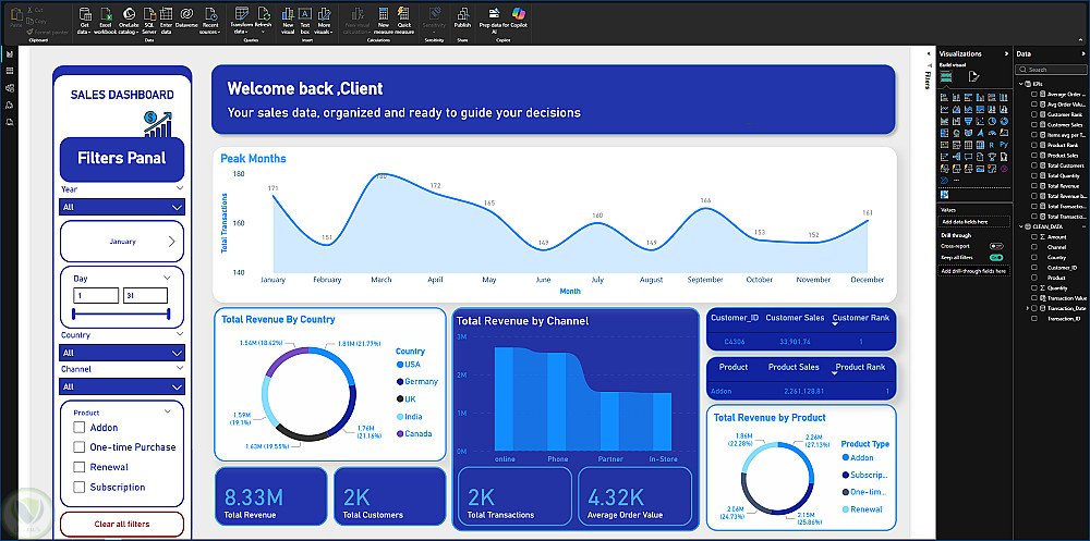 قمت بتطوير لوحة تحكم احترافية لبيانات المبيعات باستخدام Power BI، تهدف إلى تحليل أداء المبيعات بشكل شامل وسهل الفهم، مع تصميم بصري جذاب يناسبك كمتخذ قرار.