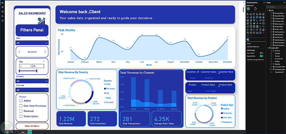 ✔ فلاتر تفاعلية شاملة (السنة – الشهر – اليوم – المنتج – الدولة – القناة)