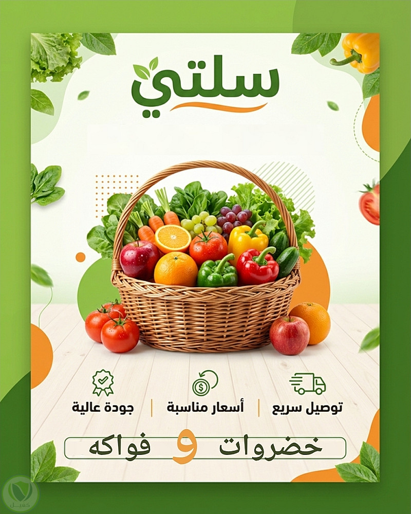 تصميم اعلان سوشل ميديا يخص محل خضروات وفواكه يسمى (سلتي)
