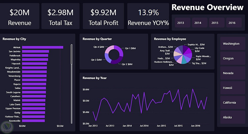 لوحة معلومات احترافية تلخص المؤشرات المالية الرئيسية - الإيرادات والضرائب والأرباح - حسب المناطق والموظفين والفترات الزمنية.
