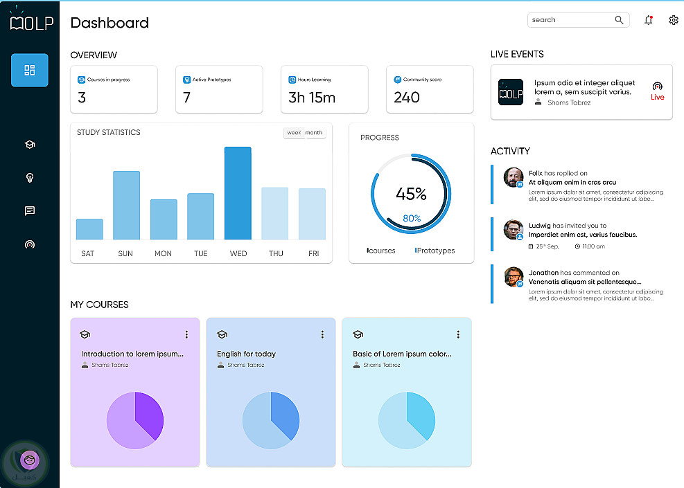 توفر OLP تجربة تعليمية سلسة عبر لوحة تحكم حديثة وسهلة الاستخدام. يمكنك متابعة تقدمك، إدارة الدورات، والتفاعل مع المجتمع في مكان واحد.