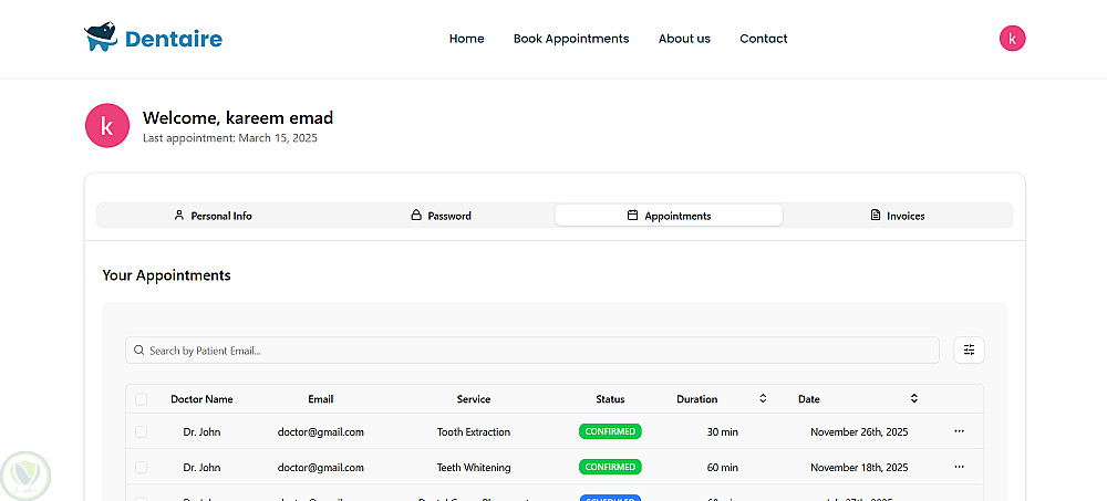 من جهة المرضى، يوفّر الموقع بوابة شخصية آمنة تتيح لهم إنشاء حسابات خاصة، حجز المواعيد مع الأطباء عبر الإنترنت، متابعة تاريخهم العلاجي، وتحميل الوصفات الطبية بصيغة PDF، مما يسهم في تحسين تجربة المريض وتوفير الوقت والجهد.