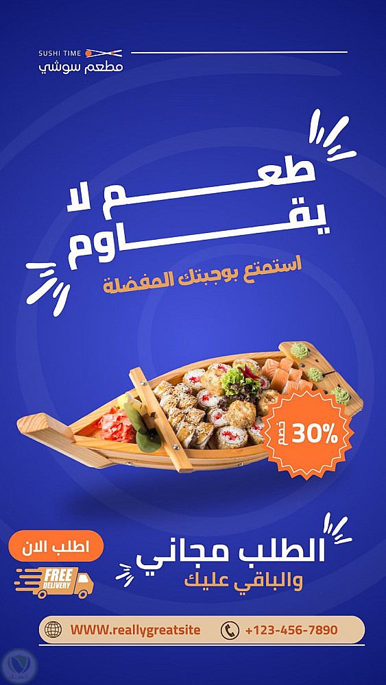 يعتمد التصميم بشكل كامل على اللون الأزرق الملكي للخلفية، وهو اختيار جريء يكسر القاعدة التقليدية لألوان المطاعم (الأحمر والأصفر)، مما يمنح الإعلان طابعاً "فريداً" و "مودرن" ويجعل ألوان السوشي الطبيعية والبرتقالية تبرز بقوة. توسط التصميم قارب سوشي خشبي متنوع، تم إخراجه بطريقة "الظل الساقط" ليعطي إيحاءً بأنه يطفو في الفراغ، مما يضيف لمسة فنية جذابة.