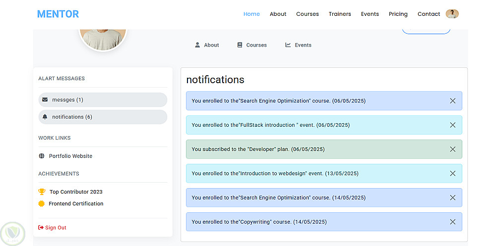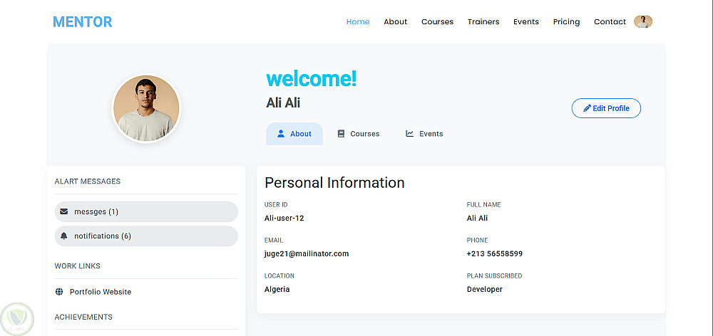 يقدم امامية للمستخدم المسجل من الدخول وتعديل بياناته واضافة الكورسات والترقية الى باقات الموقع واجهيا