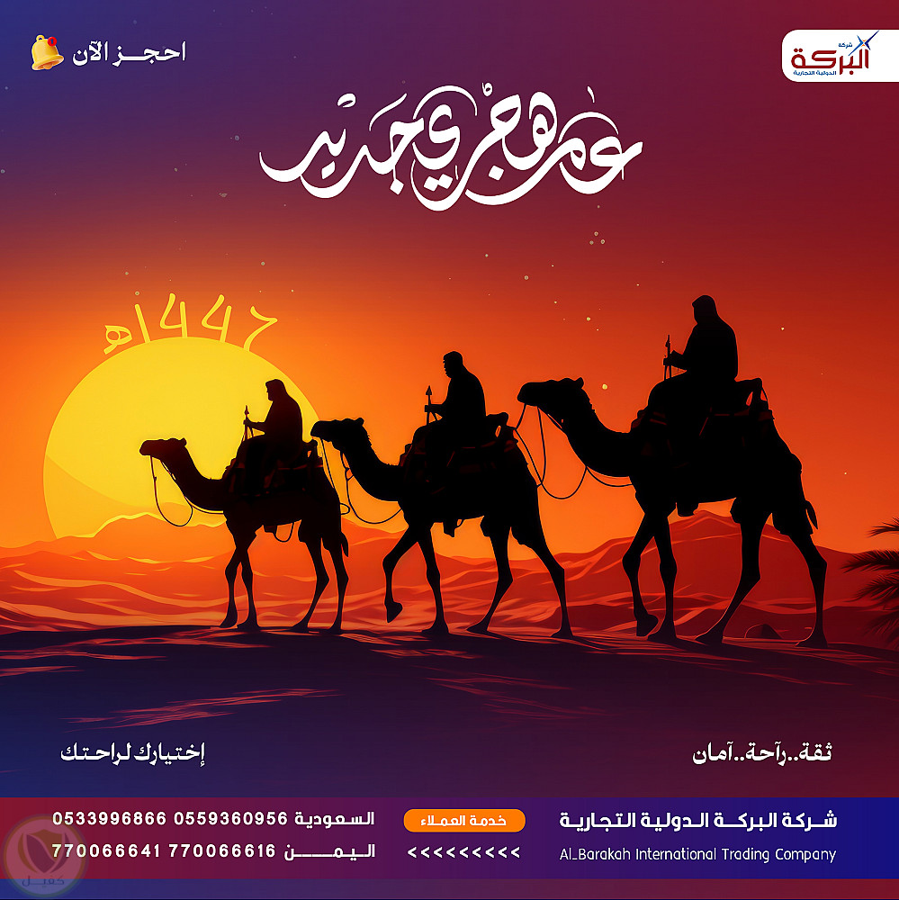 الفكرة: تصميم بوستر تهنئة يجمع بين الرمزية الدينية (الهجرة) وبين هوية الشركة التجارية.