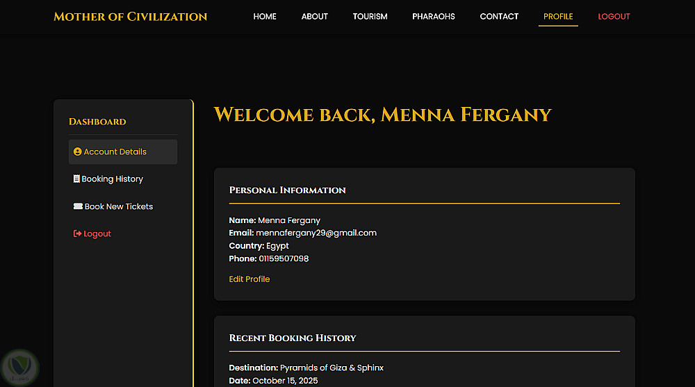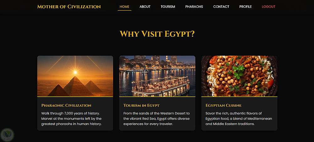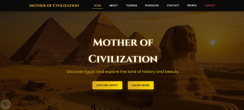 قمت بتصميم وتطوير موقع ويب احترافي بعنوان Mother of Civilization يهدف إلى إبراز عظمة الحضارة المصرية والترويج للسياحة بأسلوب عصري وجذاب.