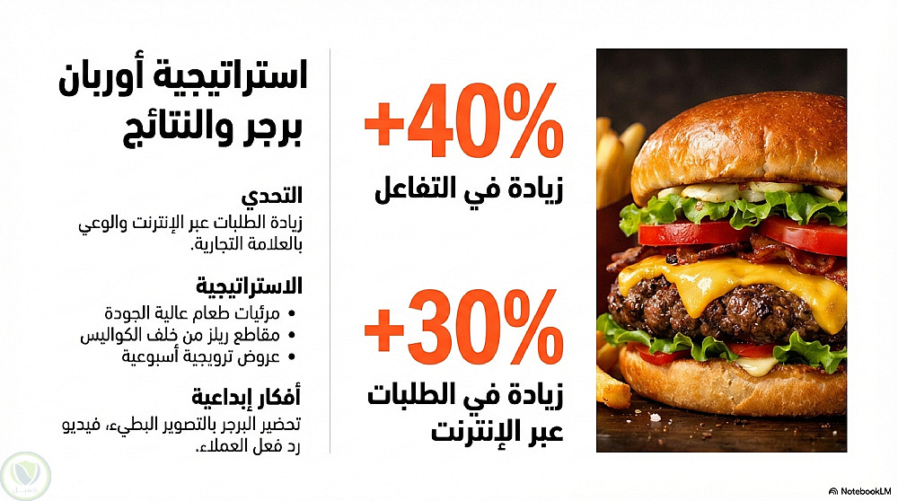 اراد مطعم وجبات سريعة زيادة الطلبات عبر اﻻنترنت والوعي بالعلامة التجارية فقمت بانشاء هوية بصرية حديتة وخطة محتوى تركز على تصوير الطعام ومقاطع الفديو القصيرة: