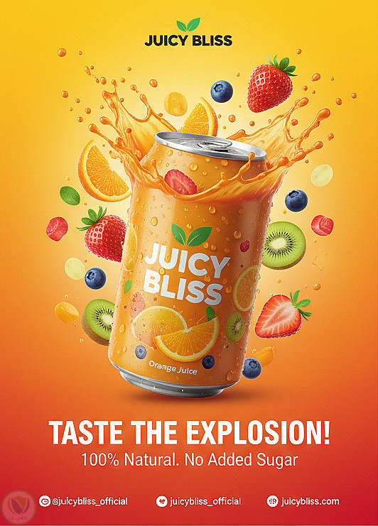 تصميم بوستر تسويقي "Juicy Bliss" يركز على الحيوية والانتعاش. استخدمت تقنيات التلاعب بالصور (Photo Manipulation) لدمج الفواكه المتطايرة مع رذاذ العصير لإعطاء إيحاء بالحركة والطاقة.