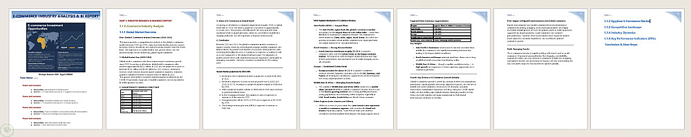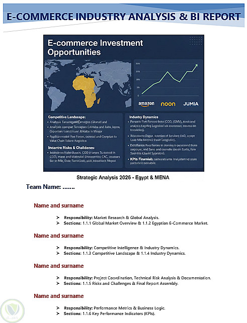 تحليل السوق من 2020 إلى 2025 ورصد حجم النمو العالمي والمحلي بالاعتماد على بيانات إحصائية دولية مثل ستاتيستا دراسة هيكلية للمنافسين الكبار مثل أمازون ونون وجوميا ومنصات بي تو بي مثل ماكس أي بي تطبيق أطر عمل استراتيجية تشمل قوى بورتر الخمس وتحليل سلسلة القيمة لفهم تدفق العمليات إدارة المخاطر وتحديات الدفع عند الاستلام والأمن السيبراني مع تقديم حلول عملية بناء منطق الأعمال من خلال 22 مؤشر أداء رئيسي تغطي الجوانب المالية والتشغيلية والتسويقية ورضا العملاء مع صياغة المعادلات الرياضية الدقيقة