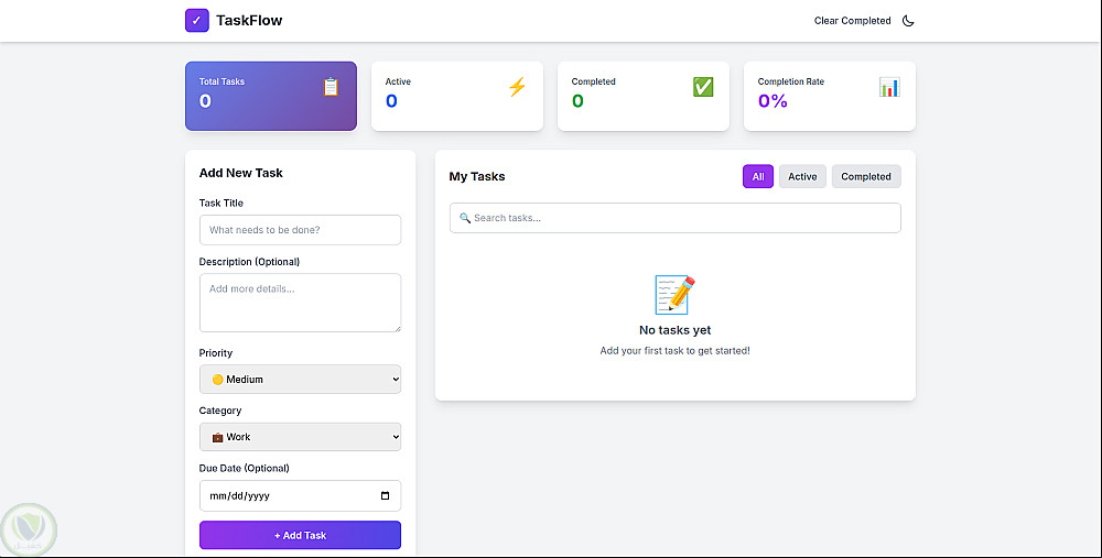 تطبيق ويب تفاعلي لإدارة وتنظيم المهام اليومية بواجهة حديثة وسهلة الاستخدام. يتيح للمستخدم إضافة المهام مع تحديد الأولوية والتصنيف وتاريخ الاستحقاق، مع إمكانية البحث والفلترة بين المهام النشطة والمكتملة. يعتمد التطبيق على LocalStorage لحفظ البيانات داخل المتصفح بدون الحاجة إلى تسجيل حساب.