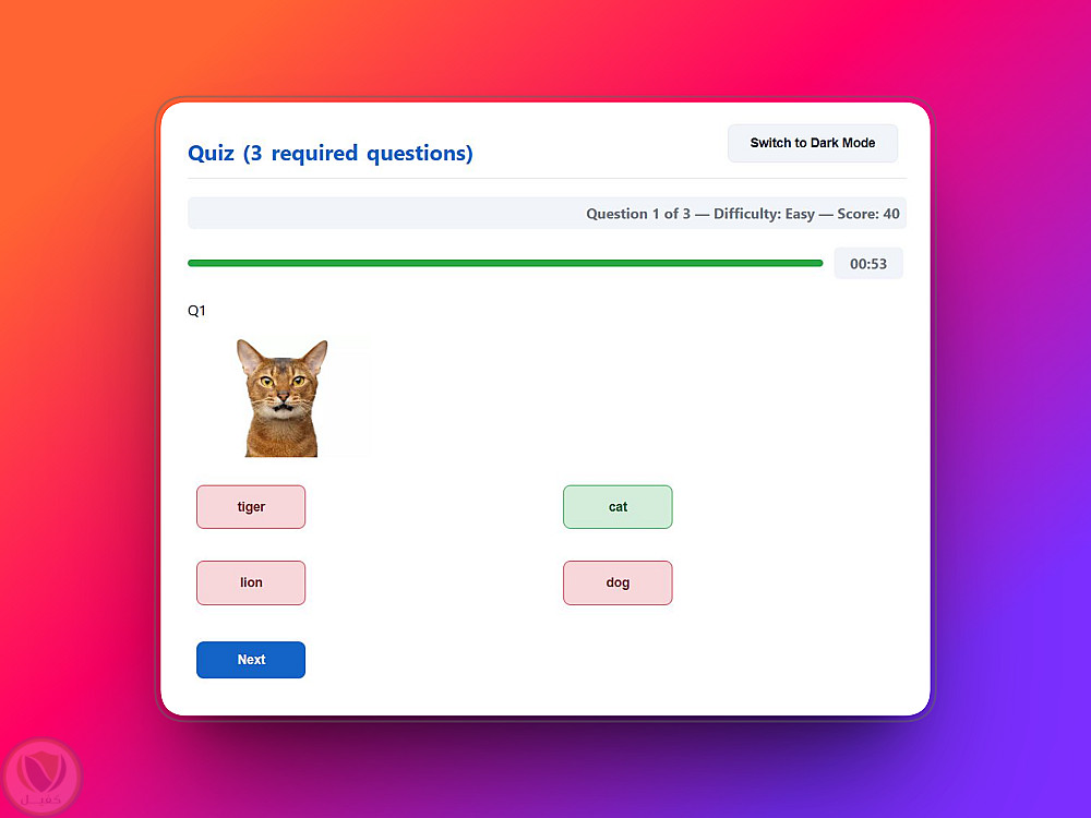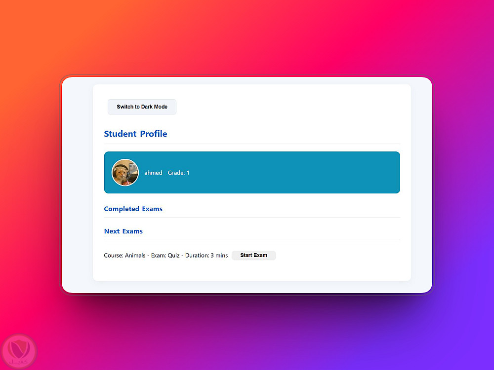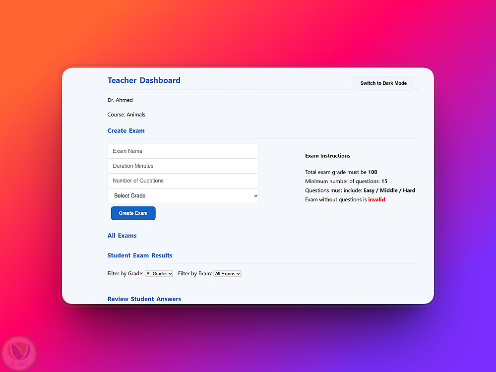 يدعم التطبيق دورين: المعلم والطالب، ويتيح إنشاء الاختبارات، مراجعة النتائج، إدارة ملفات الطلاب، وأداء الاختبارات مباشرة في المتصفح. جميع البيانات محفوظة محليًا باستخدام localStorage.