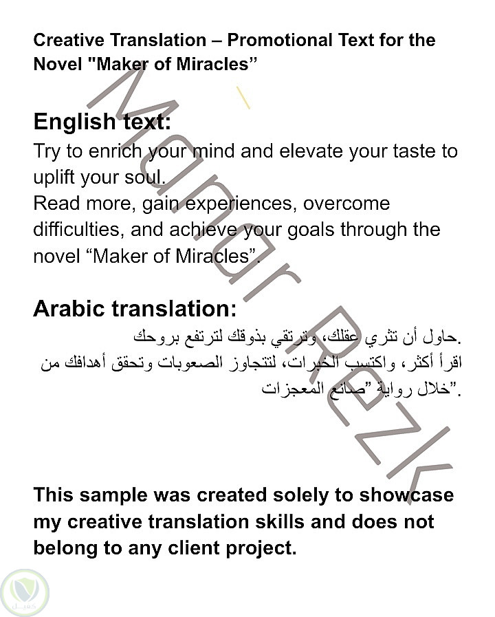 ترجمت نصًا ترويجيًا لرواية خيالية بعنوان "صانع المعجزات" من الإنجليزية إلى العربية.