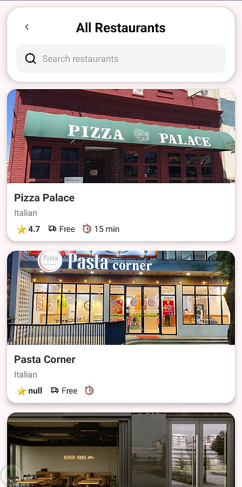 قمت بتطوير تطبيق مطاعم احترافي يدعم نظام مطعم واحد (Single Restaurant) أو عدة مطاعم (Multi-Restaurant)، مع لوحة تحكم متكاملة لإدارة العمليات بشكل كامل.