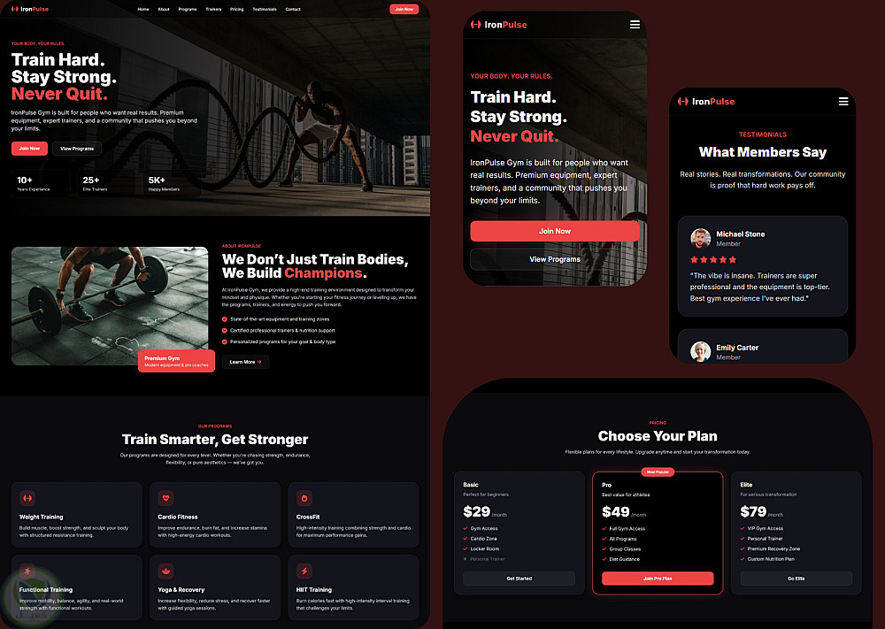 IronPulse Gym هو لاندنج بيج حديثة ومتجاوبة بالكامل، مصممة خصيصًا لمراكز اللياقة البدنية وصالات الجيم.