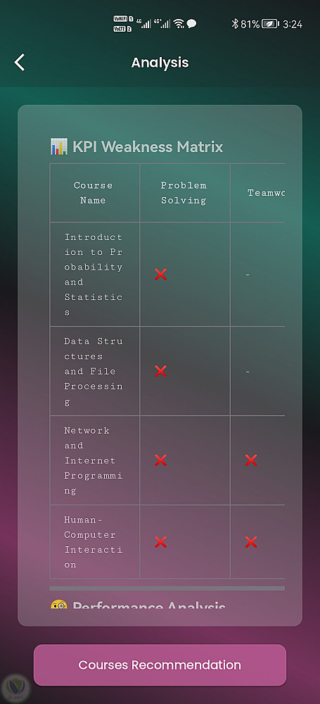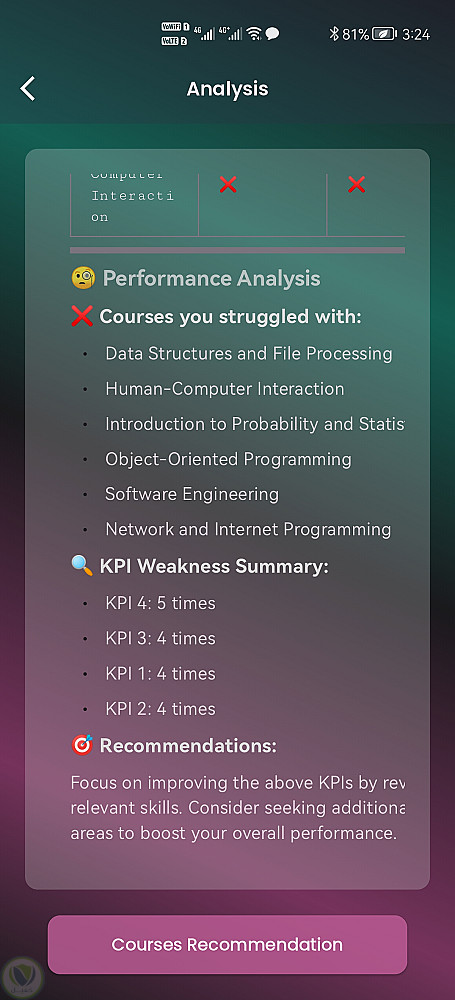 يوفر التطبيق تحليلًا لنقاط القوة والضعف، توصيات ذكية للكورسات، مقابلات تدريبية مدعومة بالذكاء الاصطناعي، ولوحة تحكم مبسطة لمتابعة تقدم الطالب مع تجربة استخدام سلسة.