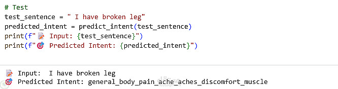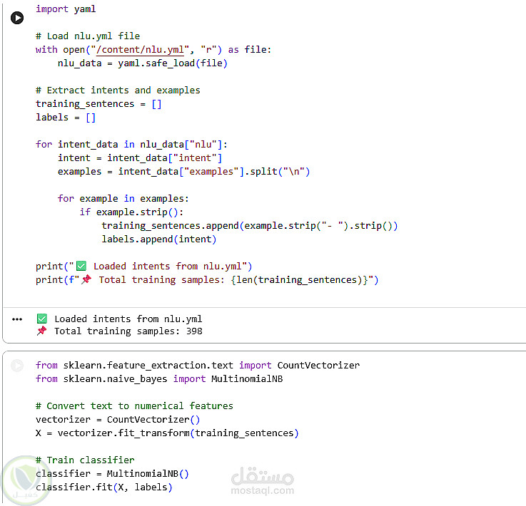 يُطبّق هذا المشروع نظامًا بسيطًا لتصنيف نوايا روبوتات المحادثة باستخدام معالجة اللغة الطبيعية (NLP) والتعلم الآلي. تُحمّل بيانات التدريب من ملف nlu.yml يحتوي على النوايا وجمل الأمثلة. تُعالج البيانات النصية مسبقًا وتُحوّل إلى خصائص رقمية باستخدام CountVectorizer، ثم يُدرّب مُصنِّف بايز الساذج متعدد الحدود لتعلم العلاقة بين جمل المستخدم ونواياها المقابلة.