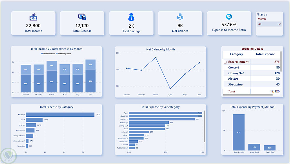 لوحة بيانات أنيقة وعملية مبنية بـ Power BI تساعد الأفراد على متابعة وإدارة ميزانيتهم الشخصية بشكل شهري. تعرض اللوحة أبرز المؤشرات المالية: إجمالي الدخل ،إجماليالمصروفات، إجمالي المدخرات، الرصيدالصافي، ونسبة المصروفات إلى الدخل (53.16%). تتضمن مقارنة شهرية بين الدخل والمصروفات، خط اتجاه للرصيد الصافي، تفصيل المصروفات حسب الفئة (السكن، الغذاء، المرافق، الرعاية الصحية، النقل، الترفيه، التسوق)، تحليل على مستوى الفئة الفرعية، وتوزيع طرق الدفع. أداة مثالية لكل من يريد السيطرة على عادات إنفاقه وتحقيق أهدافه المالية.