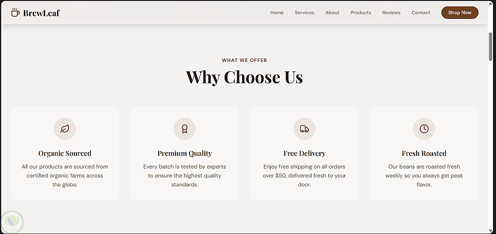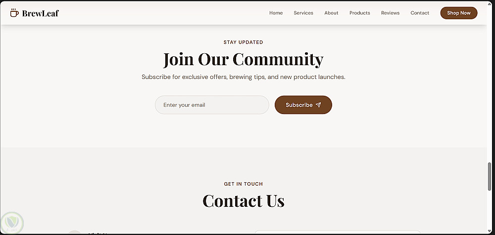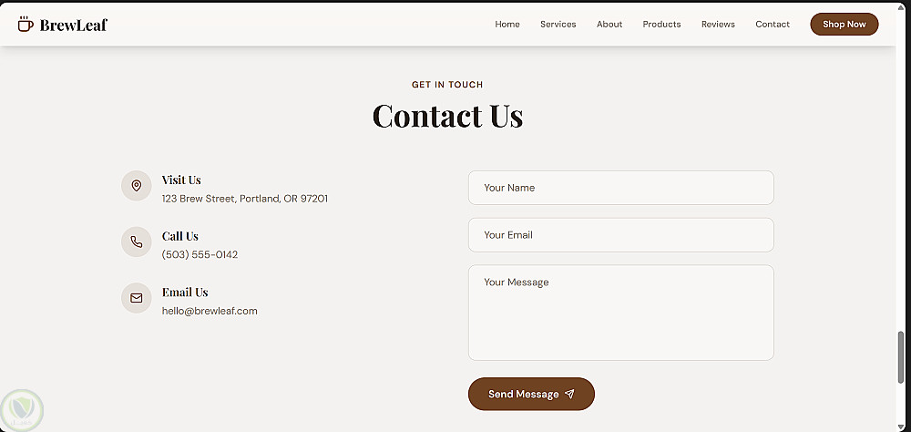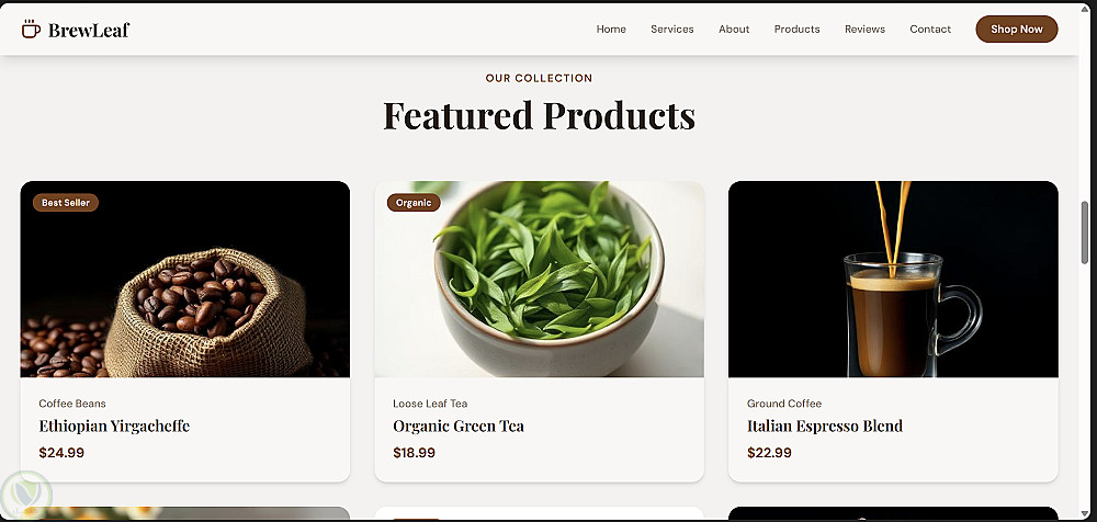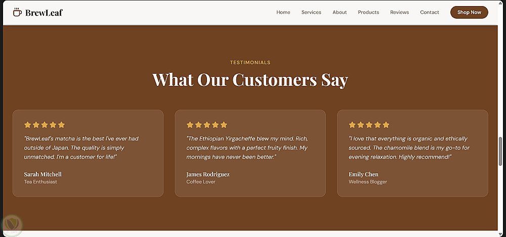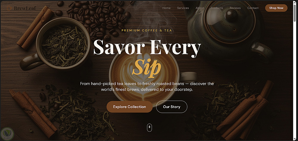 تصميم وتطوير موقع احترافي لعلامة قهوة وشاي فاخرة (BrewLeaf)