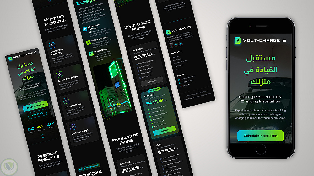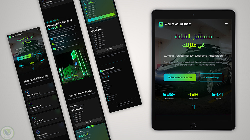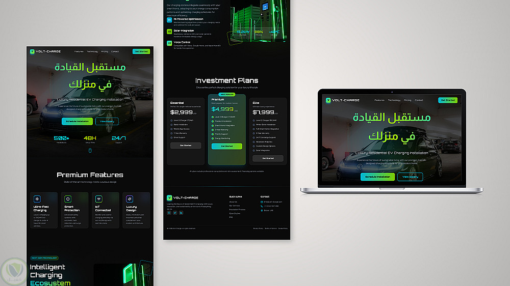 صفحة هبوط (Landing Page) بتصميم عصري، شيك، ومتجاوبة بالكامل (Responsive) لـ "Volt-Charge"، ودي خدمة مميزة لتركيب شواحن العربيات الكهربائية في البيوت.