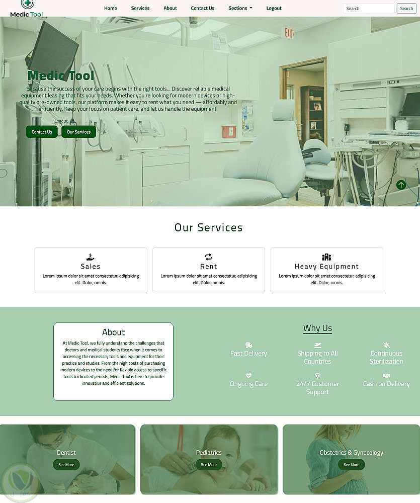 قمت بتطوير موقع إلكتروني متخصص في تأجير وشراء الأدوات الطبية، يتميز بواجهة مستخدم سهلة الاستخدام مبنية بتقنيات HTML, CSS, JavaScript, Bootstrap.