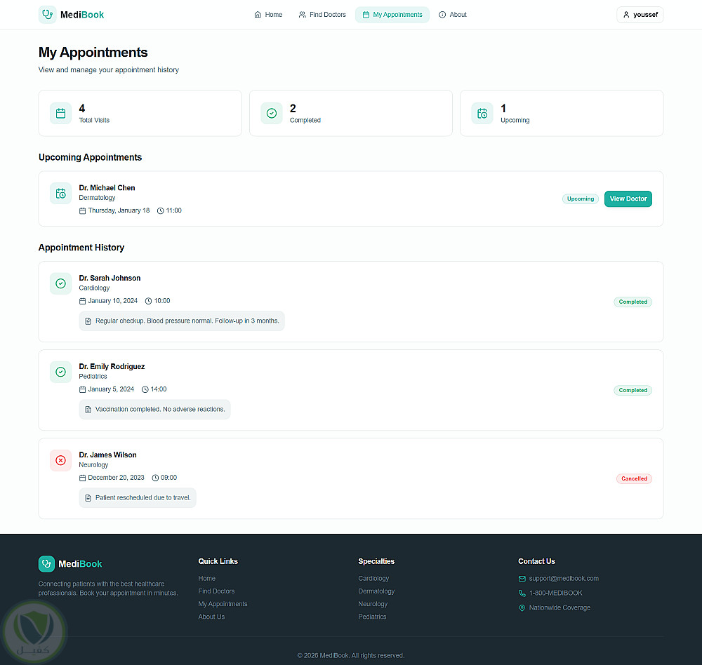 4. **لوحة التحكم (My Appointments): ملخص رقمي للمواعيد (القادمة والسابقة) ومتابعة ملاحظات الطبيب.