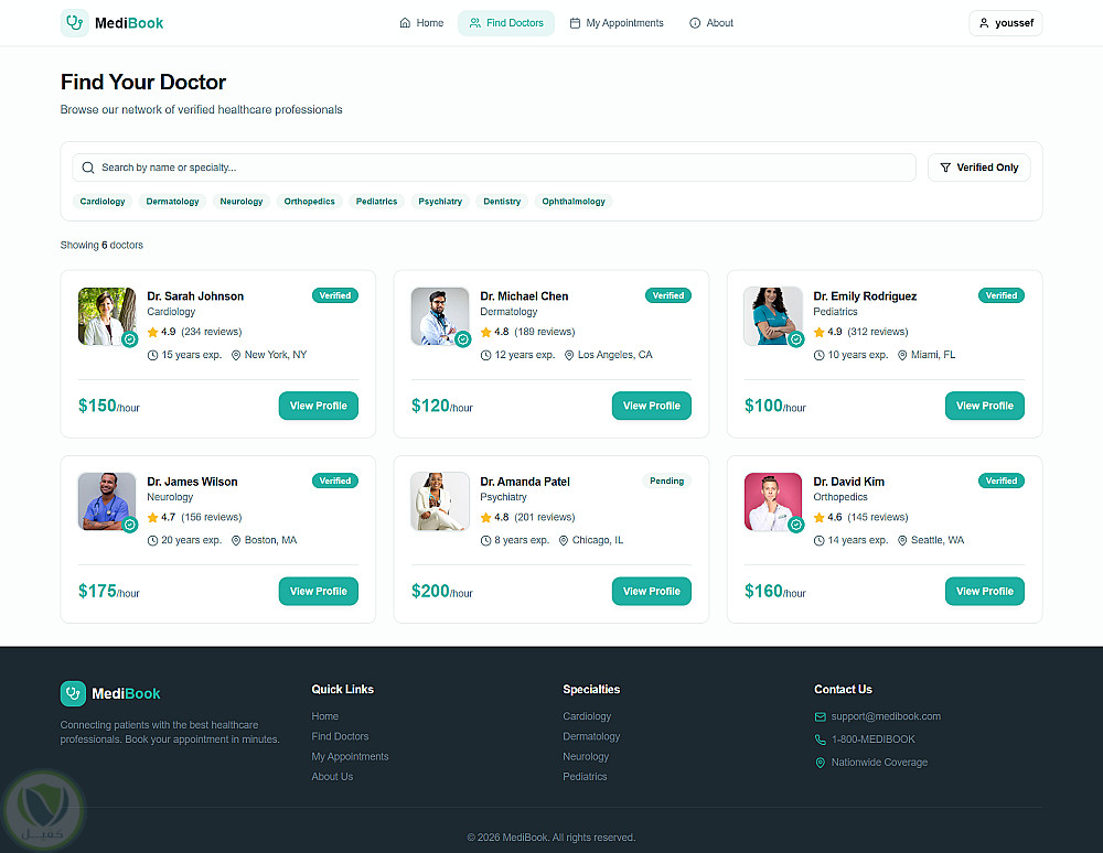 2. **البحث عن طبيب:نظام فلترة متقدم (بالاسم، التخصص، أو التوثيق) مع بطاقات تعريفية تشمل الخبرة والسعر.