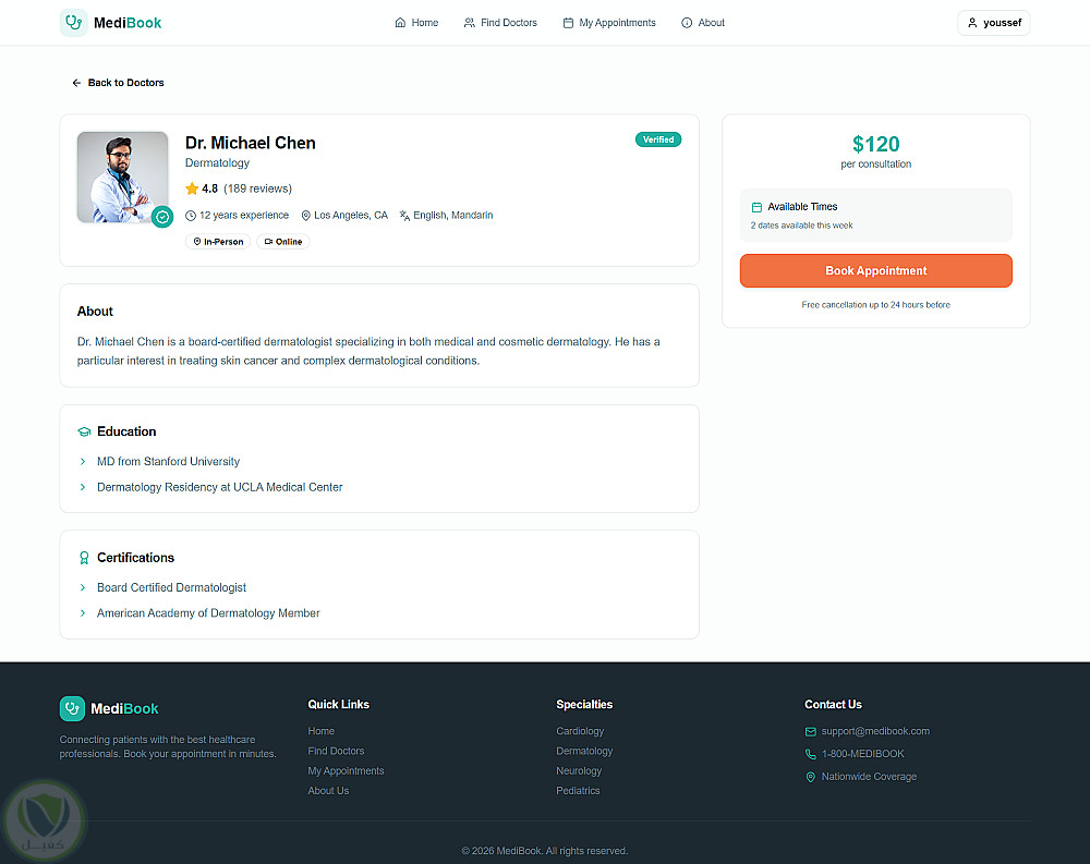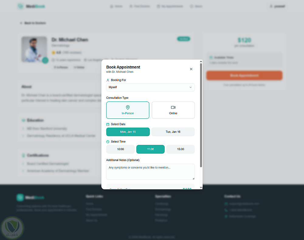 3. **الملف الشخصي والحجز: عرض سيرة الطبيب المهنية، مع نافذة حجز (**Modal**) تتيح اختيار نوع الاستشارة (حضوري/أونلاين) وتحديد الموعد.
