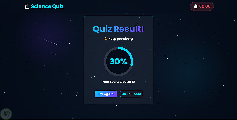 يحتوي على 10 أسئلة علمية متنوعة تغطي الفيزياء والكيمياء وعلم الأحياء، مع مؤقت زمني يعرض الوقت المتبقي في الـ header ويظهر شريط تقدم داخل الاختبار. عند انتهاء الإجابة يظهر تقرير النتيجة مع نسبة مئوية.