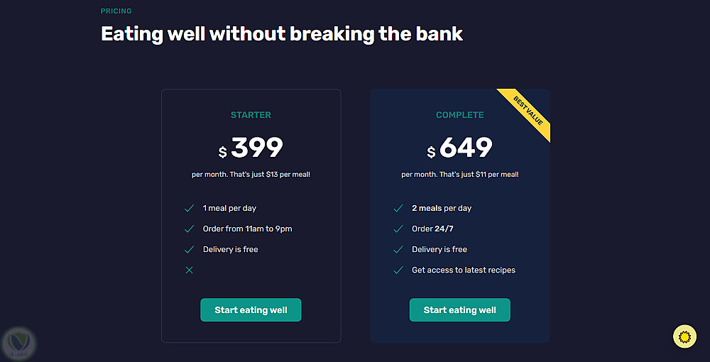 نوع العمل: صفحة ويب كاملة تحاكي موقع شركة توصيل وجبات ، تشمل قسم Hero وعرض الوجبات والتقييمات وخطط الأسعار ونموذج التسجيل.