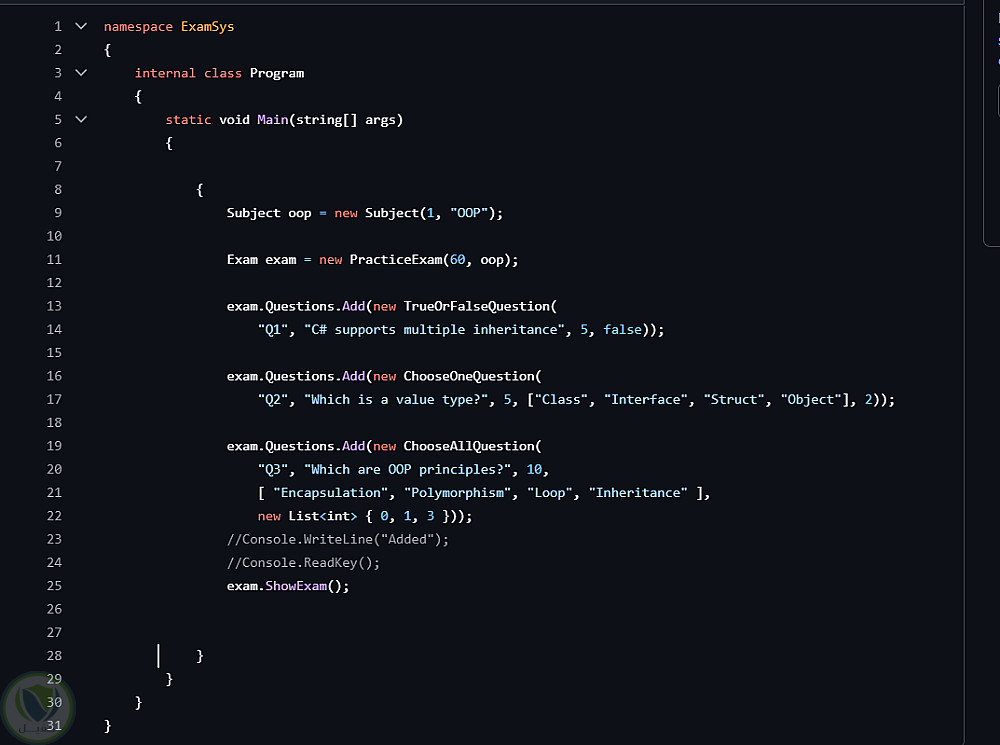 مشروع برمجي متقدم تم بناؤه باستخدام لغة #C، يهدف إلى محاكاة نظام امتحانات أكاديمي متكامل عبر واجهة السطر البرمجي (Console). تم تصميم النظام بالتركيز بشكل أساسي على تطبيق مفاهيم البرمجة كائنية التوجه (OOP) لضمان مرونة الكود وقابلية التوسع.