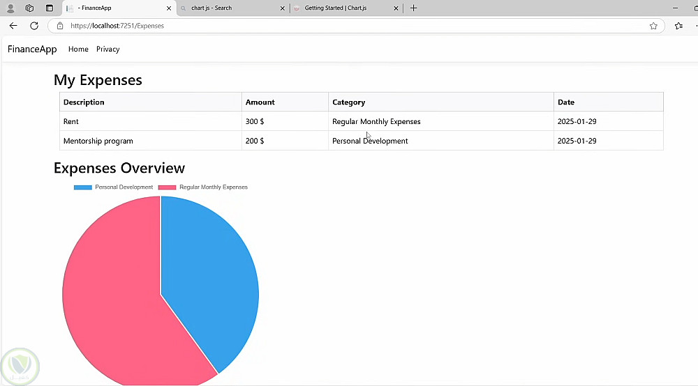 نظرة عامة بيانية (Charts): رسم بياني دائري (Pie Chart) يوضح توزيع النفقات بصرياً لسهولة المقارنة بين الفئات.