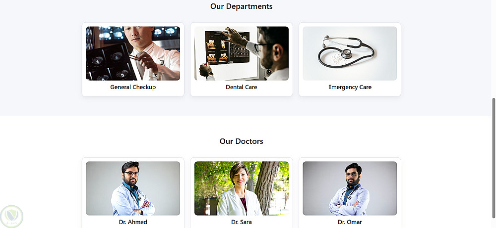 الموقع يحتوي على صفحة رئيسية حديثة فيها قسم عن العيادة، أقسام الخدمات (كشف عام، أسنان، طوارئ)، وقسم الأطباء بالصور، بالإضافة إلى صفحة مستقلة لحجز المواعيد فيها نموذج حجز كامل (اسم، إيميل، هاتف، تاريخ، رسالة) مع ربط بين الصفحة الرئيسية وصفحة الحجز لتجربة استخدام سهلة للمريض.