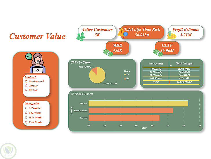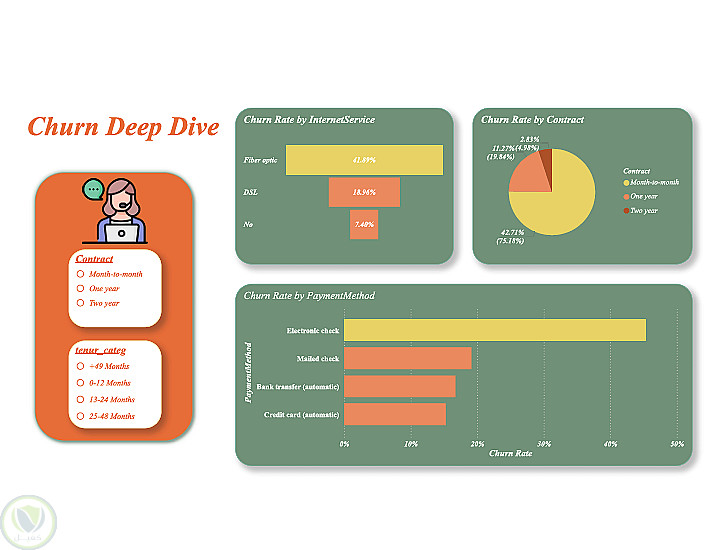 شمل التحليل دراسة عدة عوامل مثل نوع العقد، مدة الاشتراك، الخدمات المشترك بها، والرسوم الشهرية، بالإضافة إلى تحليل توزيع العملاء واكتشاف الأنماط المرتبطة بترك الخدمة. كما تم استخدام الرسوم البيانية ولوحات المعلومات التفاعلية لعرض النتائج بطريقة واضحة تسهّل فهم البيانات واتخاذ القرارات.