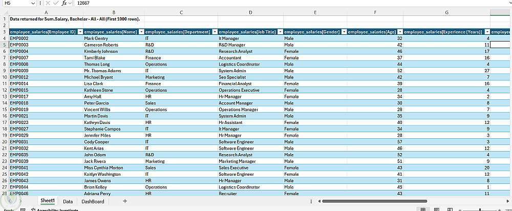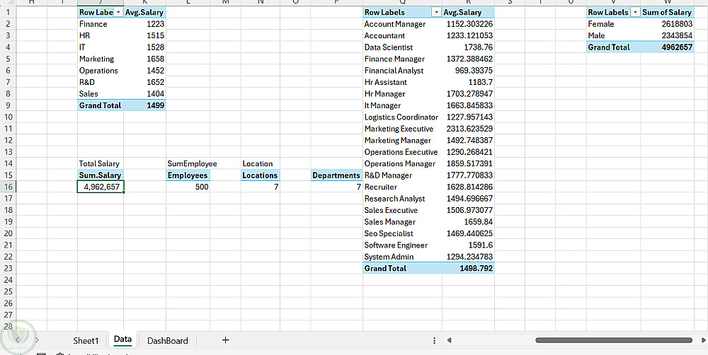 الشيت ده بيقدّم تحليل شامل لرواتب الموظفين في قسم الموارد البشرية (HR)، وبيعتمد على بيانات مجمّعة (Aggregated Data) باستخدام Pivot Tables لعرض متوسط الرواتب وإجماليها من زوايا مختلفة.