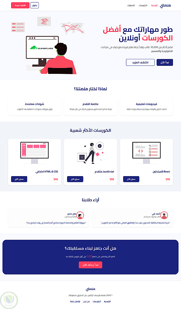 بناء صفحة هبوط (Landing Page) كاملة: تضم أقسام (الرئيسية، مميزات المنصة، الكورسات الأكثر شعبية، آراء الطلاب، وقسم التسجيل).
