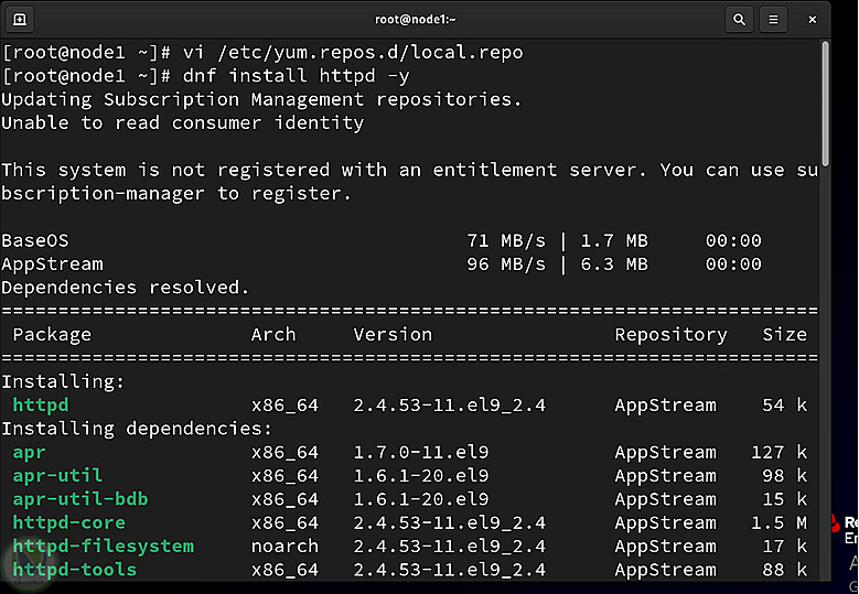 ضبط TCP/IP والـ Hostname وإعداد مستودعات YUM من BaseOS وAppStream