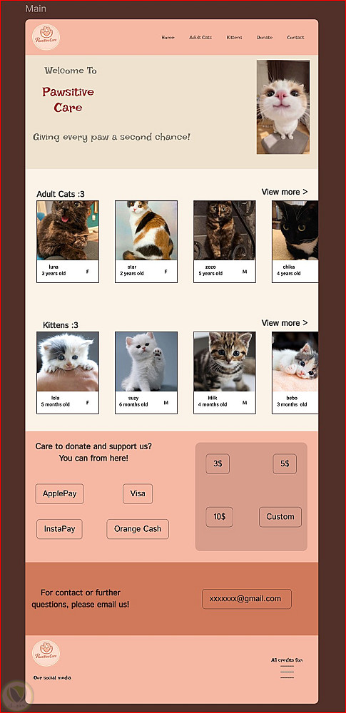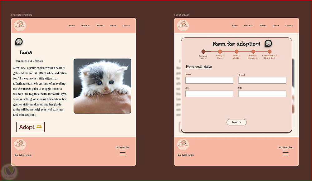 باستخدام Figma، قمتُ بتصميم وتنفيذ مفهوم واجهة مستخدم وتجربة مستخدم لموقع إلكتروني مخصص لتبنّي القطط والتبرع لها.