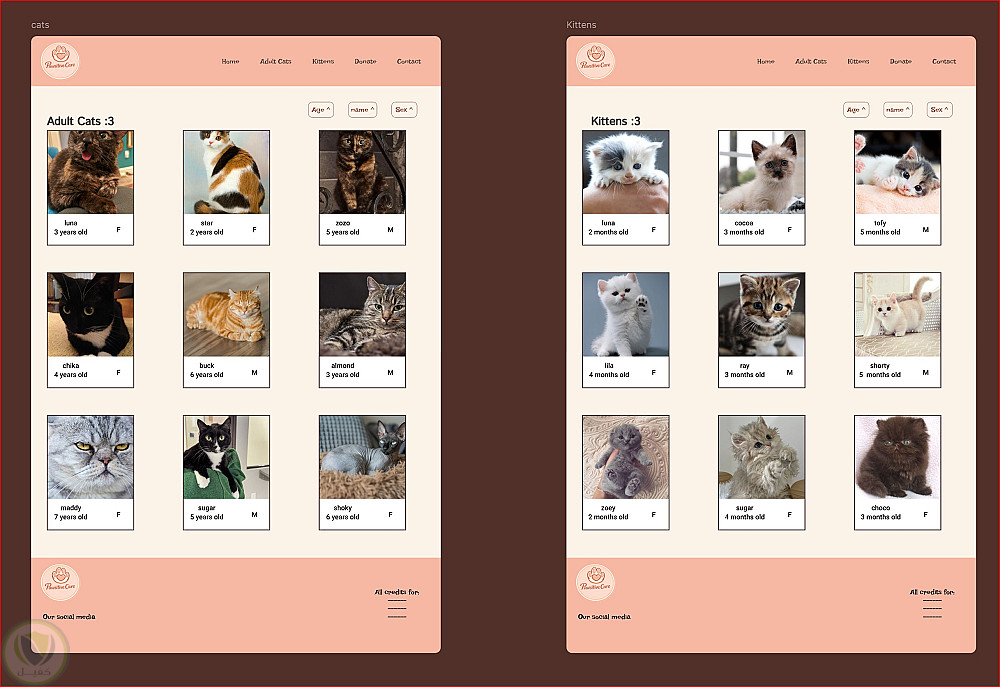 نظّمتُ المحتوى في أقسام واضحة للقطط البالغة والقطط الصغيرة، بحيث يعرض كل قسم الاسم، النوع (ذكر/أنثى)، ووصفًا مختصرًا.