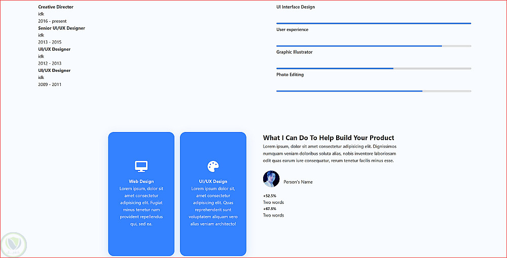 يحتوي الموقع أيضًا على قسم المشاريع والمهارات لعرض الأعمال السابقة والدورات والمهارات المكتسبة. بعد ذلك يوجد قسم آراء العملاء (Testimonials) الذي يعرض تقييمات العملاء السابقين لبناء الثقة.