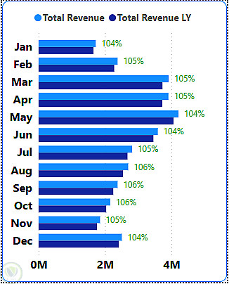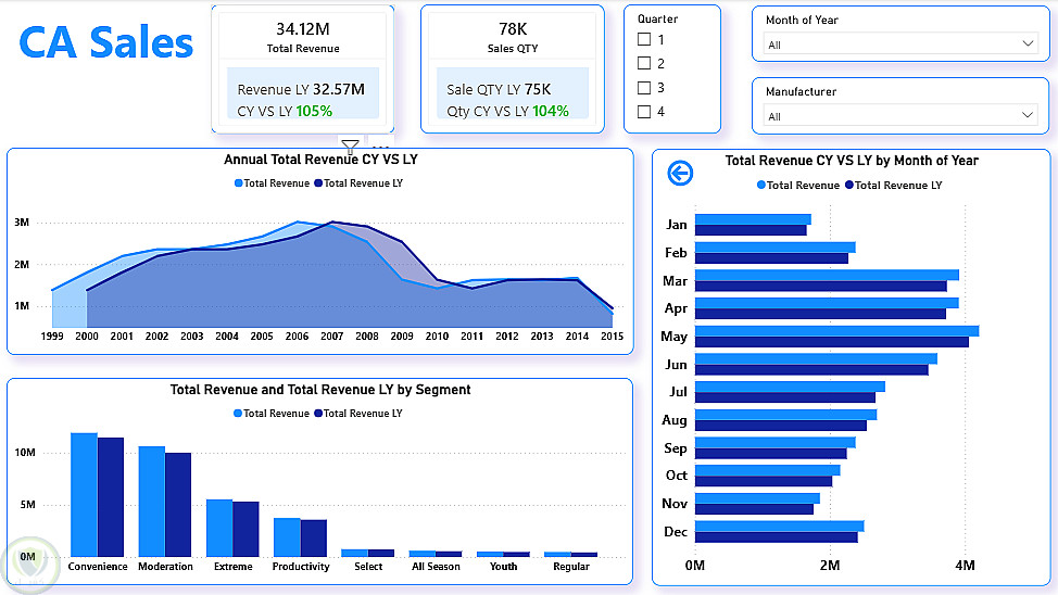-KPI Cards لعرض مقارنة بين المبيعات والإيرادات في السنة الحالية والسابقة.